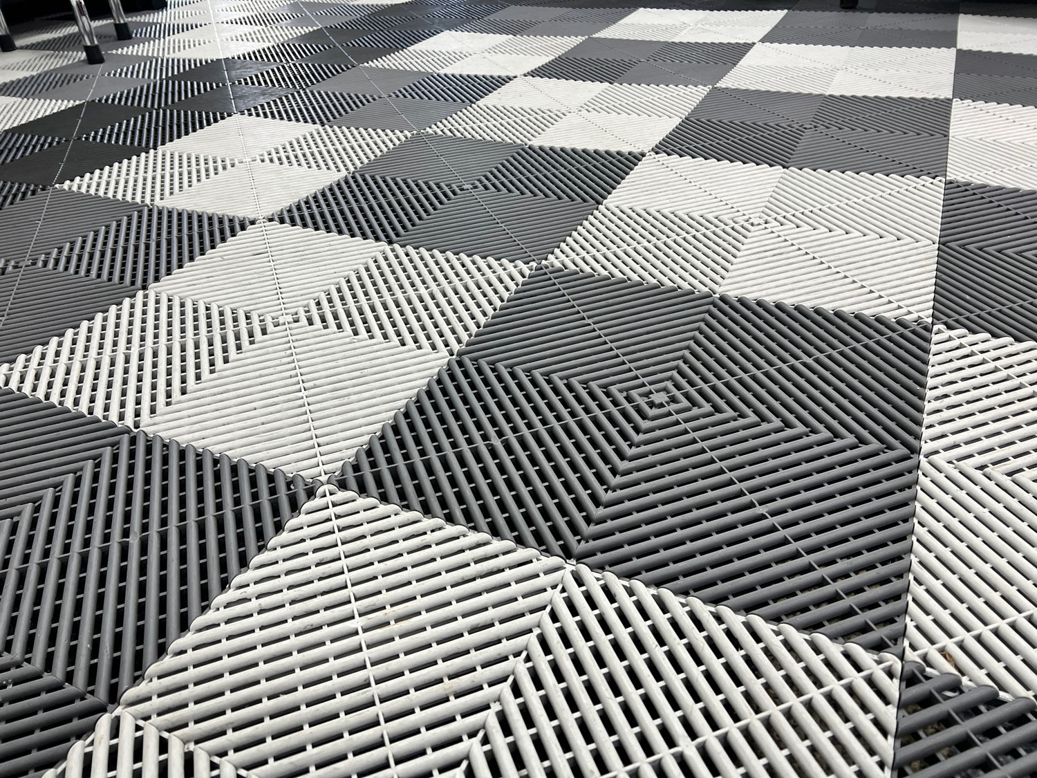 We have 2 types of instant DIY PVC garage floor tiles to do any size garage, podium or display area.