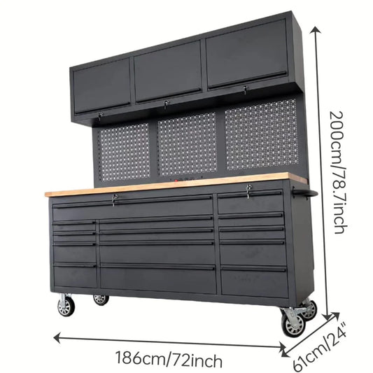 1.8M Stainless Steel Tool Chest with 9-Drawers + Cupboard and Overhead cabinets