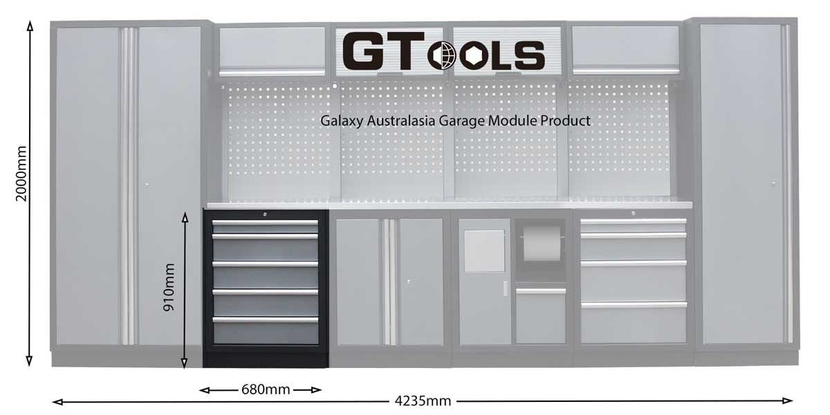 5-Drawer cabinet for your tools. Makes up a component in the garage module system.