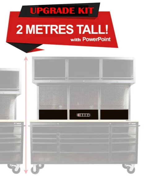 For the 1.8M rolling cabinet GTX series, this kit has 3 panels that sits under the existing pegboard, it uses the same vertical pillars that come with the basic unit, they are simply mounted one bolt hole upwards to move to the 2M height.